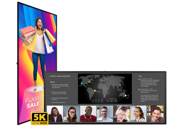 Planar® URW105-ERO-T is a 105″ 5K (5120 x 2160) ultra-wide format LCD touch screen display ideally sized to suit the most popular unified communications and video collaboration platforms such as Microsoft Teams® with its Front Row layout. Its 21:9 aspect ratio is excellent for native cinematic video playback. It features Planar® ERO-LCD™ protective glass and pin-point accurate projected capacitive touch that supports up to 50 simultaneous touch points. Its commercial-grade construction offers 24×7 reliability and remote monitoring facilitates email alerts if an unexpected event occurs. View two sources simultaneously with dual layout or Picture-in-Picture. The display is TAA-Compliant.